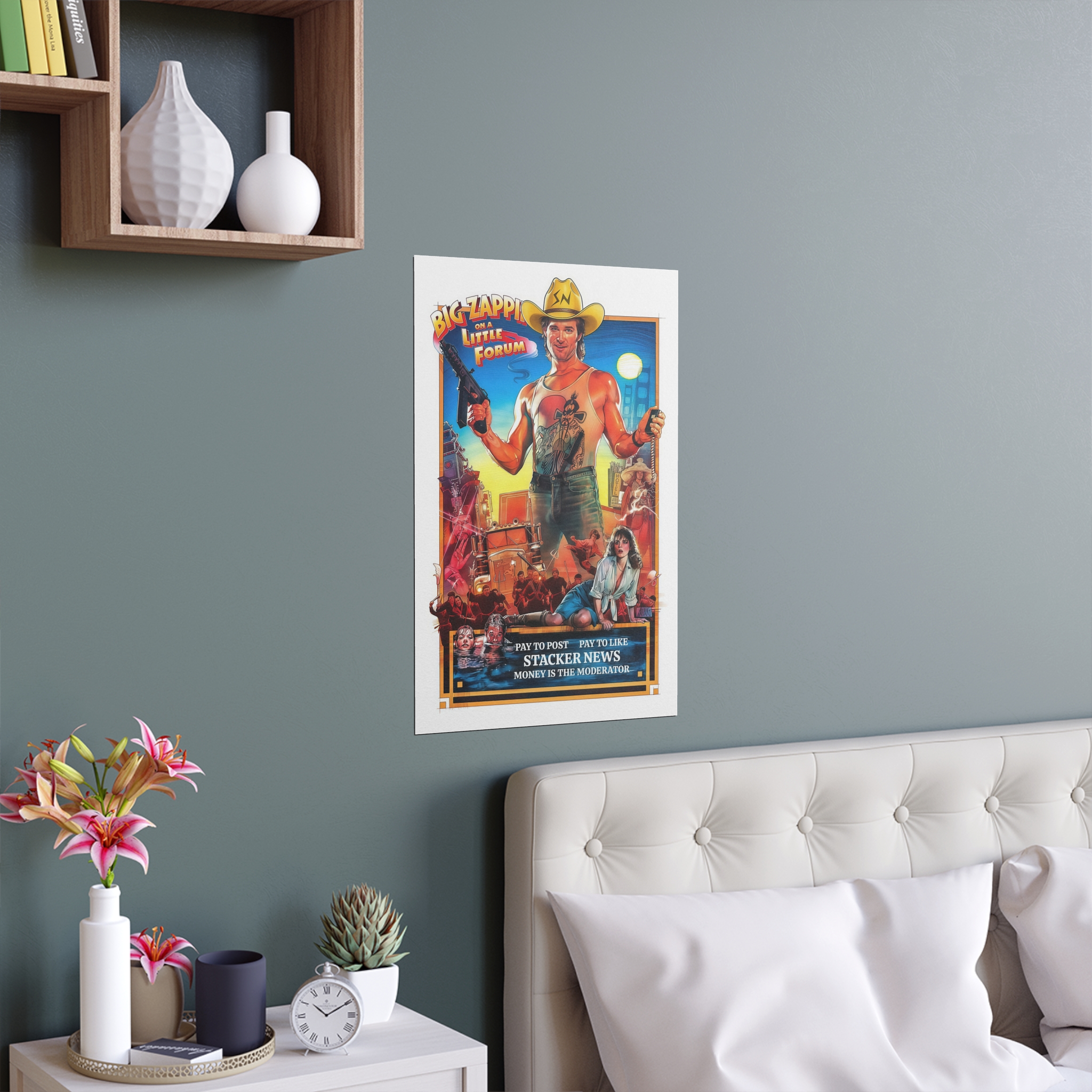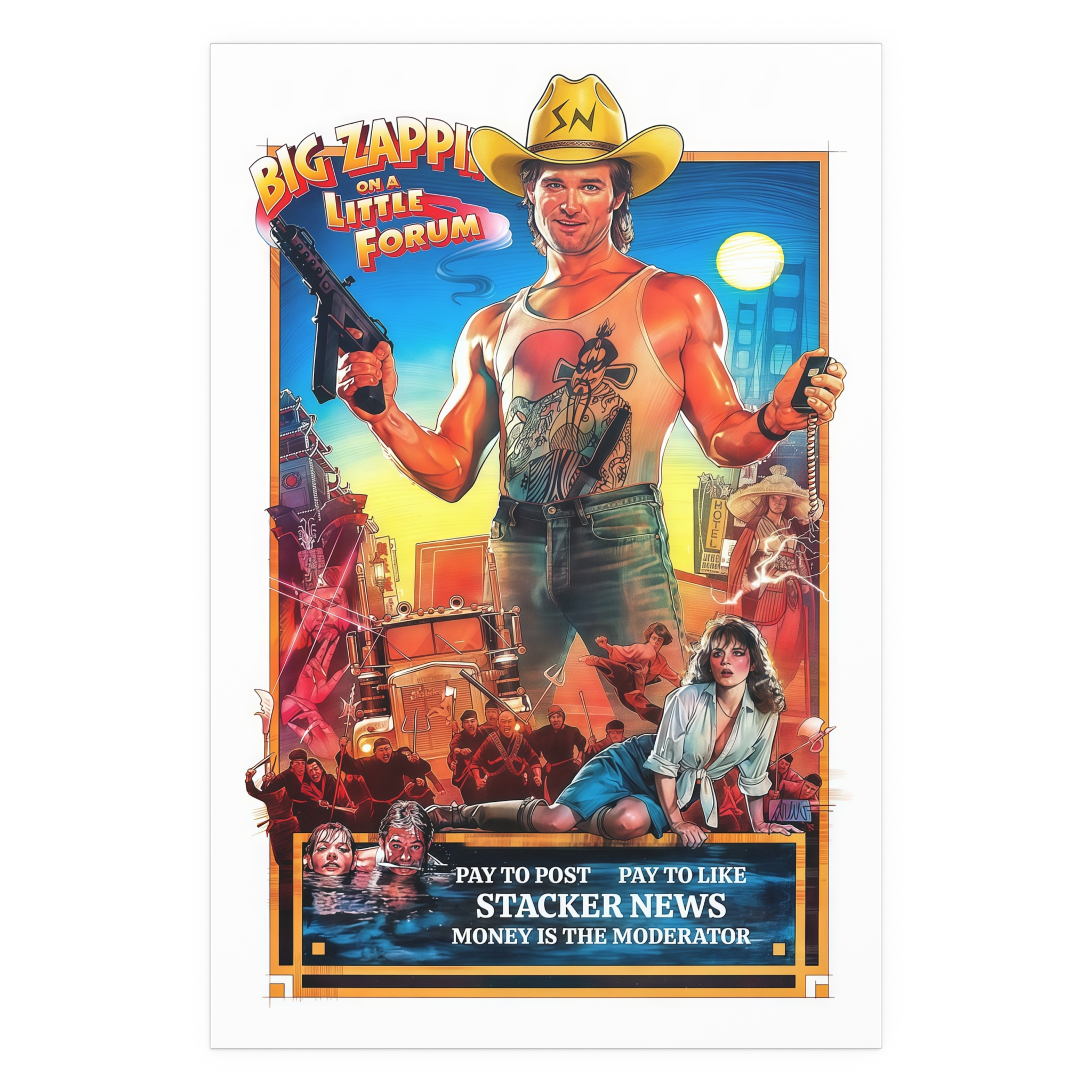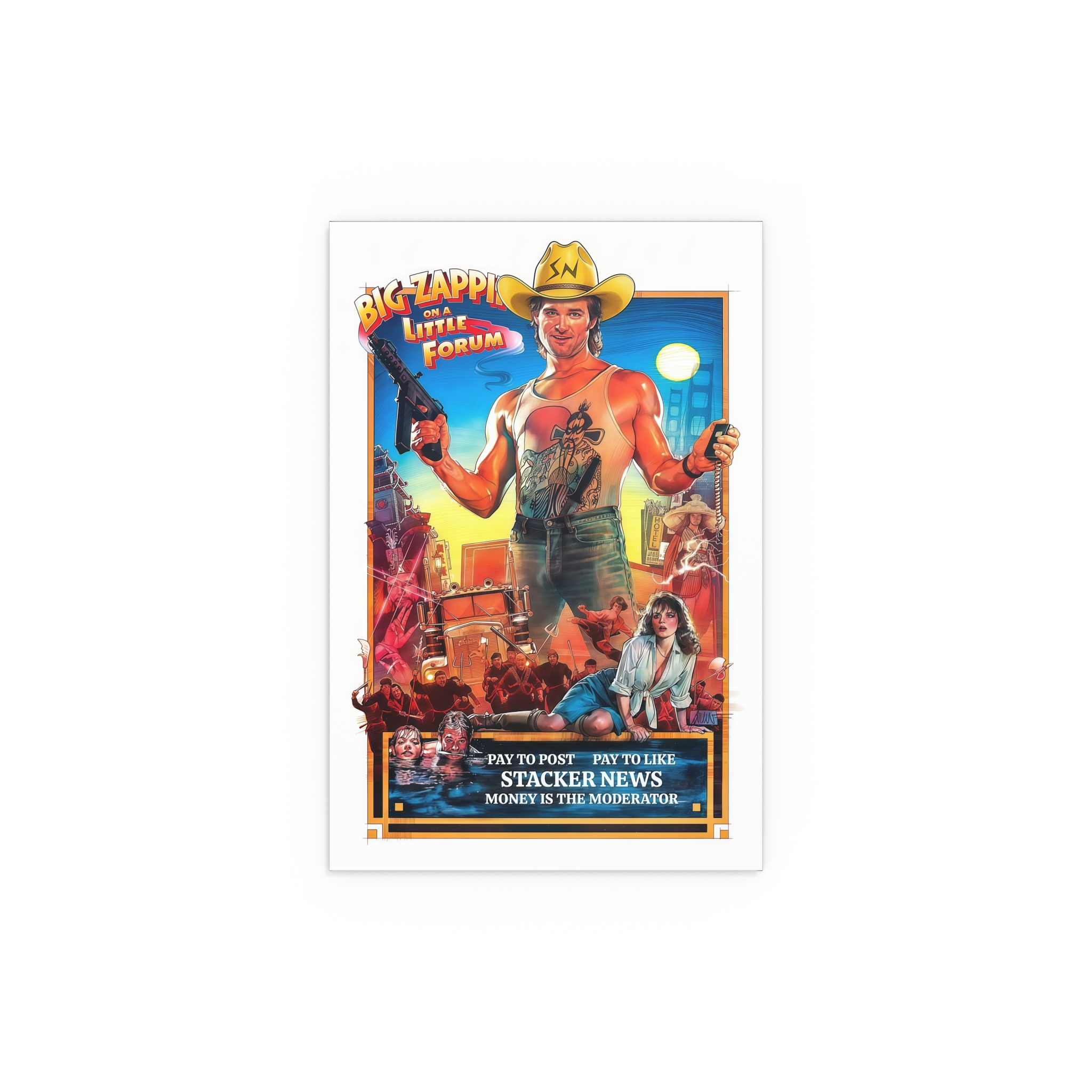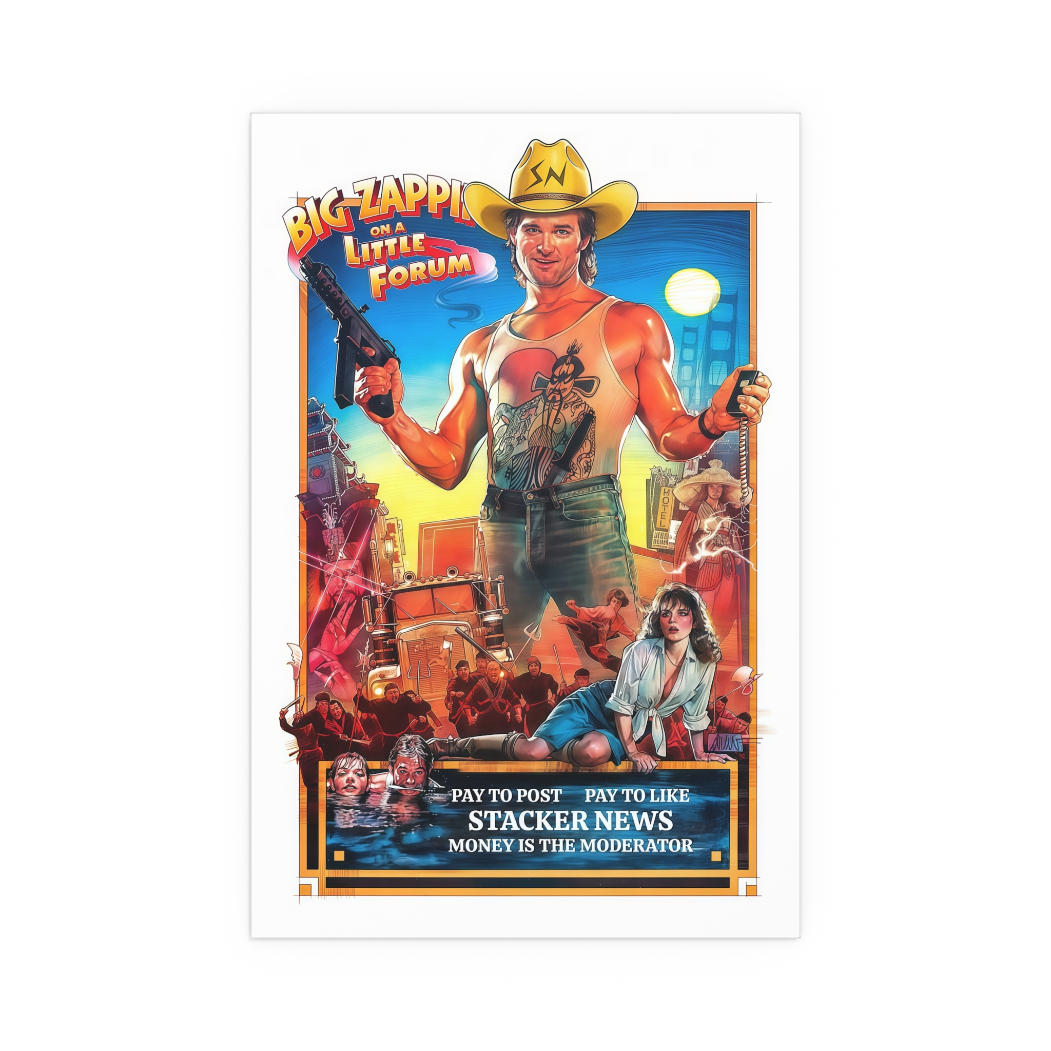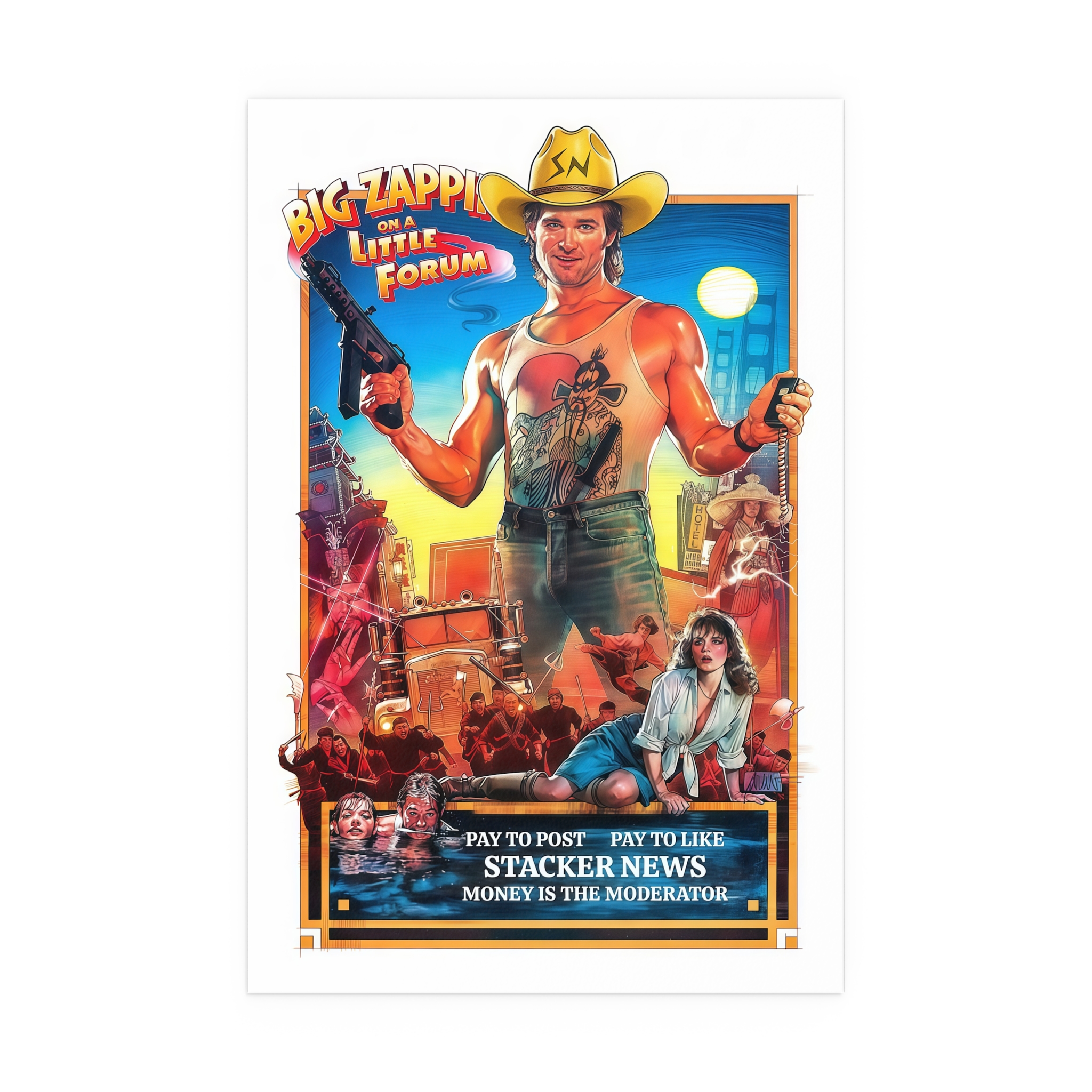 Channel the grit and energy of a vintage screen with this silk-finish poster from the “The Money is the Moderator” series. Each print feels like a relic from a long-ago theater marquee, reimagined as a STACKER.NEWS advertisement—bold headlines, saturated hues, and that slightly rebellious, cinematic vibes.